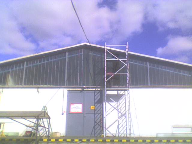 Épületfelújítás egyrétegű kopolit üveggel: a tetőszerkezet alatt ferde vágású spicc alakú kivágásokkal.