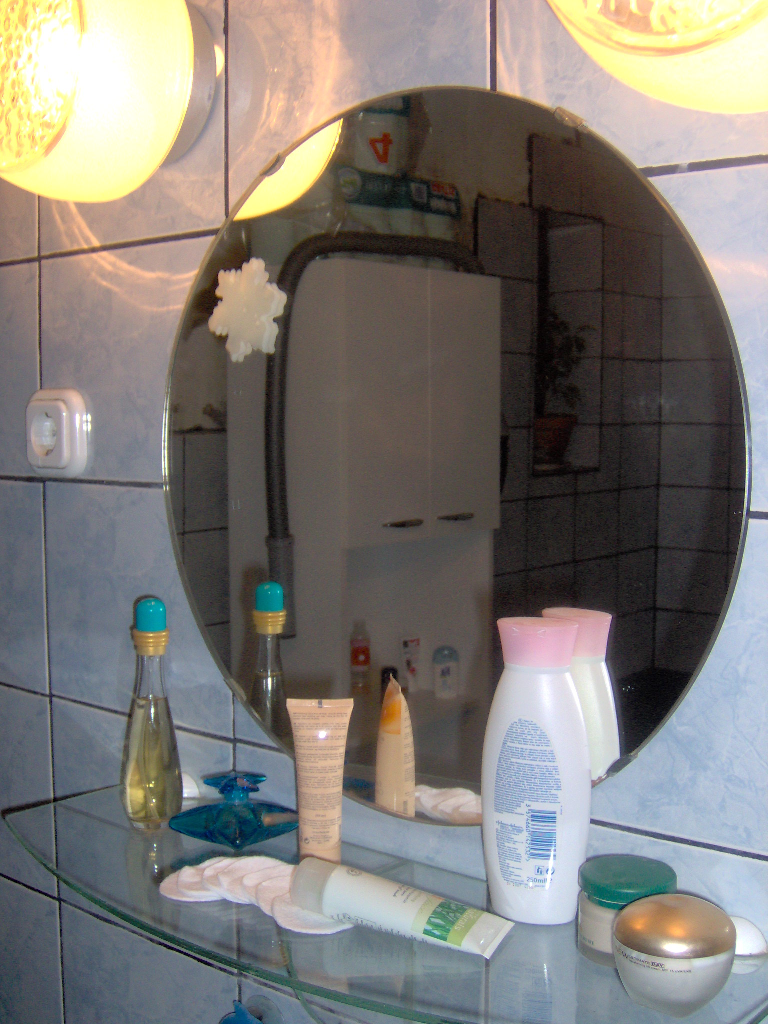 Fürdőszobákba is készítünk tetszetős pipere-kombinációt: a képen látható tükör 5mm-es, élcsiszolt termékünk, melyet akár az Ön által beszerzett szerelékkel is fel tudunk rögzíteni. A piperepolc ragasztott biztonsági üvegből készül (törés esetén is egyben marad), kivágva, szintén élcsiszolva és polcszerelékkel kerül kivitelezésre.